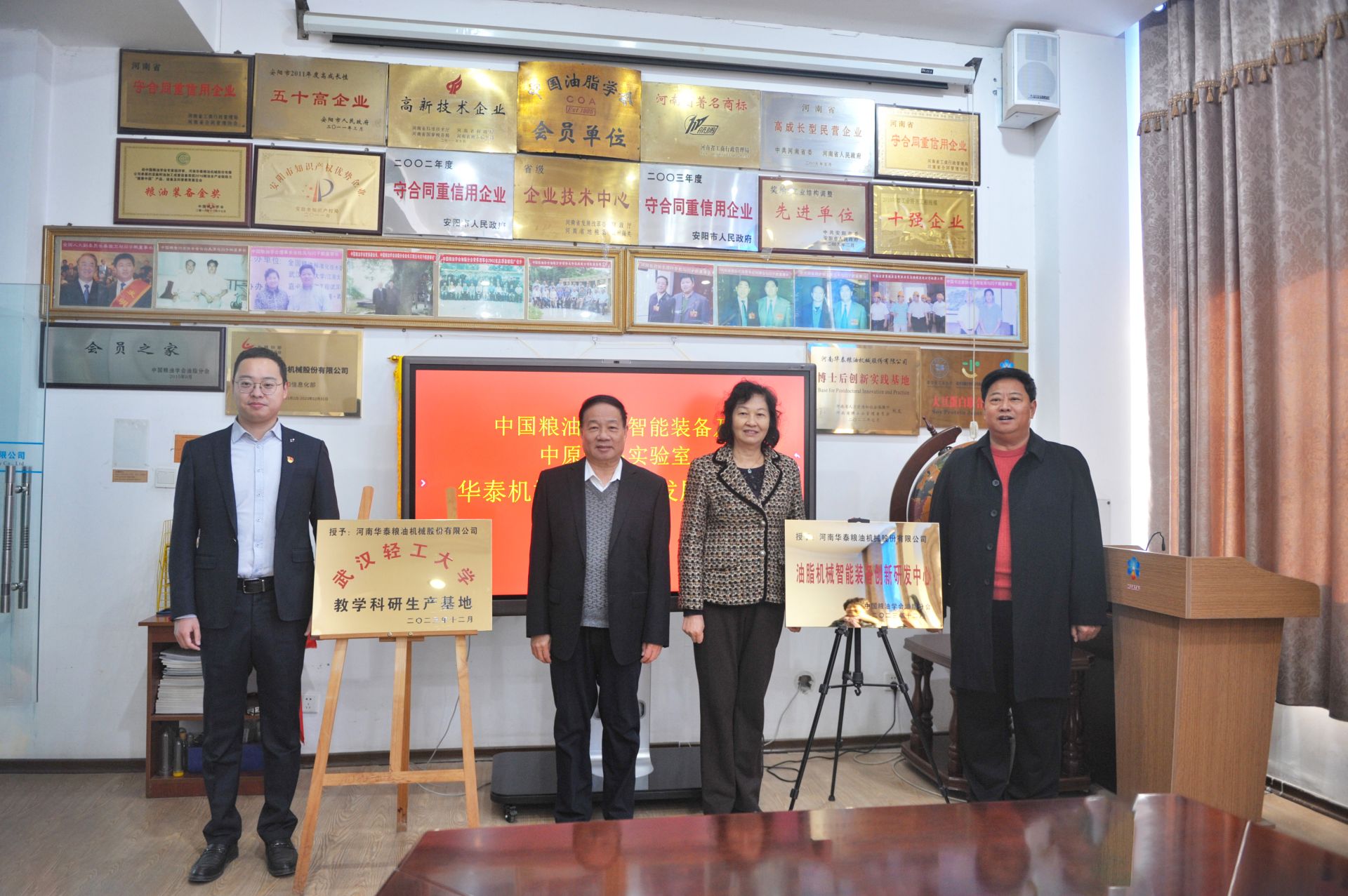 会上,中国粮油学会油脂分会副会长相海研究员宣读了《授予华泰公司油脂机械智能设备创新研发中心决定》的文件。张桂凤和严子鹏董事长一起工作‘油脂机械智能设备创新研发中心’揭牌。张桂凤说:“中国粮油学会油脂分会把在粮油行业最有影响力油脂机械智能设备创新研发中心设置在华泰,是华泰在油脂智能装备行业领域影响力的最好证明,也是对华泰在技术实力、行业地位的充分肯定,学会将一如既往地支持华泰在科研领域创新建设和科研人才培养。河南华泰粮油机械股份有限公司一直致力于油脂智能装备的研发和生产,其创新精神和产品品质得到了业界的高度认可。华泰积极推动油脂加工装备的智能化、高效化、绿色化发展,为提升我国油脂产业的综合竞争力做出了重要贡献。